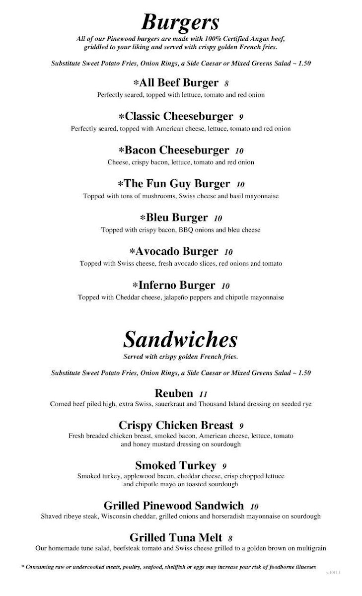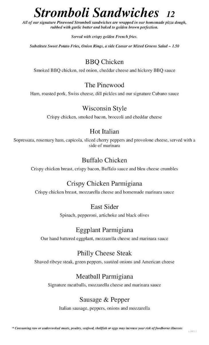The Pinewood Pub & Pizza Menu offers a delightful mix of traditional pub food and mouthwatering pizza, all served in a warm and welcoming atmosphere. Located in the heart of Chepachet, Rhode Island, the menu features an array of options to satisfy every craving. From savory appetizers to hearty entrees, there's something for everyone. The pizza is a highlight, with a variety of fresh toppings and a perfectly crispy crust. Whether you're in the mood for a classic cheese pizza or something more adventurous, you’ll find a pie that hits the spot. In addition to pizza, the menu also includes signature sandwiches, fresh salads, and comforting pub favorites like wings and burgers. Every dish is made with care, using quality ingredients that keep guests coming back for more. Whether you're here for a quick bite or a relaxing meal with friends and family, Pinewood Pub & Pizza ensures you'll have a satisfying dining experience.